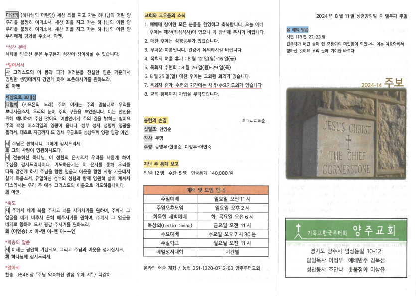 2024년 8월 11일 주보 작성자 정보 담임목사 작성 작성일 2024.08.16 19:47 컨텐츠 정보 1,081 조회 목록 본문 성령강림일 후 열두째 주일 주보 SNS 공유 관련자료 이전 2024년 8월 18일 주보 작성일 2024.08.21 13:26 다음 2024년 8월 4일 주보 작성일 2024.08.07 19:07 댓글 0 등록된 댓글이 없습니다. 로그인한 회원만 댓글 등록이 가능합니다. 목록