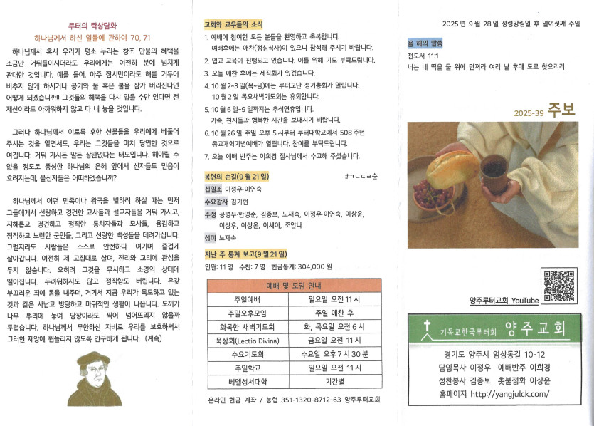 2025년 9월 28일 주보 작성자 정보 담임목사 작성 작성일 2025.10.01 15:43 컨텐츠 정보 519 조회 목록 본문 성령강림일 후 열여섯째 주일 SNS 공유 관련자료 이전 2025년 10월 5일 주보 작성일 2025.10.10 00:26 다음 2025년 9월 21일 주보 작성일 2025.09.23 16:25 댓글 0 등록된 댓글이 없습니다. 로그인한 회원만 댓글 등록이 가능합니다. 목록