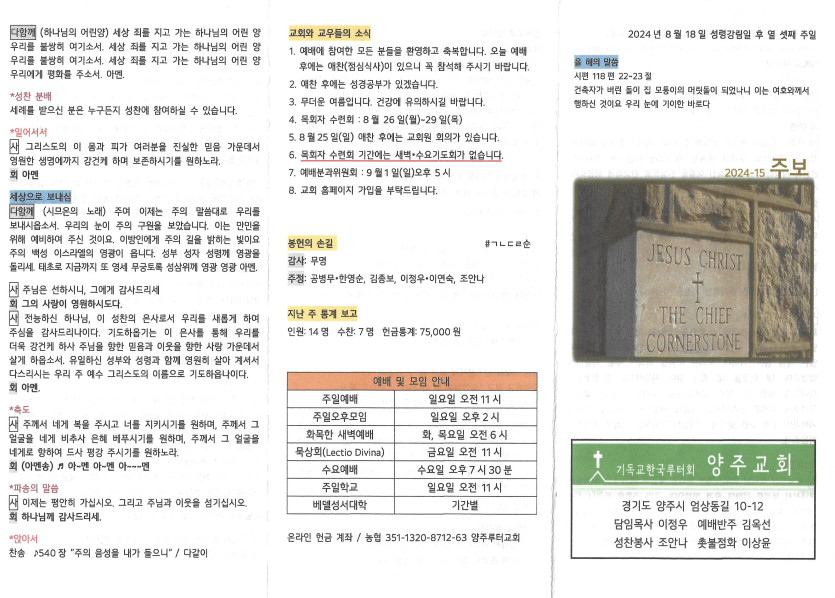 2024년 8월 18일 주보 작성자 정보 담임목사 작성 작성일 2024.08.21 13:26 컨텐츠 정보 1,186 조회 목록 본문 성령강림일 후 열셋째주일 SNS 공유 관련자료 이전 2024년 8월 25일 주보 작성일 2024.08.30 16:36 다음 2024년 8월 11일 주보 작성일 2024.08.16 19:47 댓글 0 등록된 댓글이 없습니다. 로그인한 회원만 댓글 등록이 가능합니다. 목록