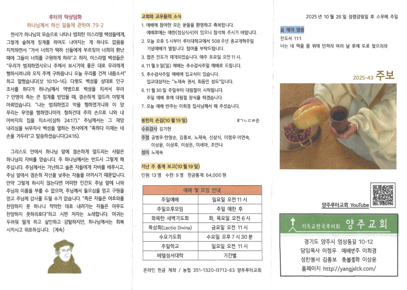 2025년 10월 26일 주보 작성자 정보 담임목사 작성 작성일 2025.10.30 16:17 컨텐츠 정보 473 조회 목록 본문 성령강림일 후 스무째 주일 SNS 공유 관련자료 이전 2025년 11월 2일 주보 작성일 2025.11.16 00:35 다음 2025년 10월 19일 주보 작성일 2025.10.23 16:27 댓글 0 등록된 댓글이 없습니다. 로그인한 회원만 댓글 등록이 가능합니다. 목록