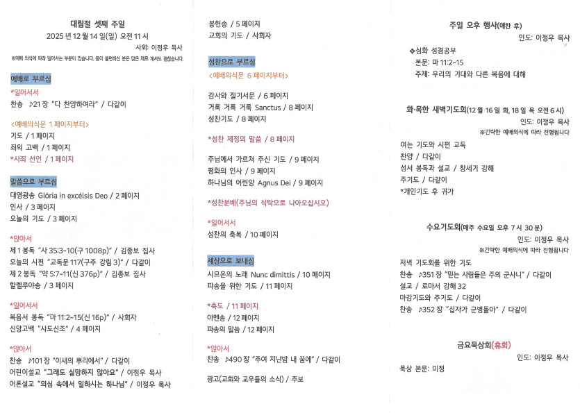 2025년 12월 14일 주보 작성자 정보 담임목사 작성 작성일 2025.12.16 16:17 컨텐츠 정보 320 조회 목록 본문 대림절 셋째 주일 SNS 공유 관련자료 이전 2025년 12월 21일 주보 작성일 2025.12.28 23:58 다음 2025년 12월 7일 작성일 2025.12.13 13:11 댓글 0 등록된 댓글이 없습니다. 로그인한 회원만 댓글 등록이 가능합니다. 목록