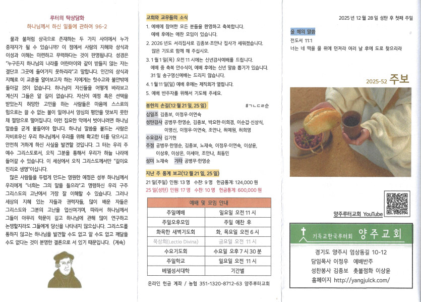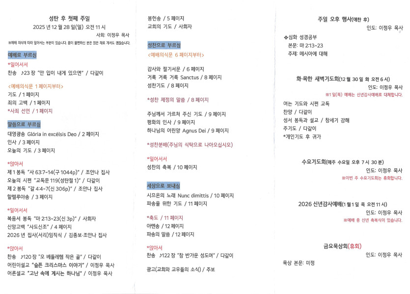 2025년 12월 28일 주보 작성자 정보 담임목사 작성 작성일 2025.12.29 00:21 컨텐츠 정보 258 조회 목록 본문 성탄 후 첫째 주일 SNS 공유 관련자료 이전 2026년 1월 1일 주보 작성일 2026.01.07 23:32 다음 2025년 12월 25일 주보 작성일 2025.12.29 00:17 댓글 0 등록된 댓글이 없습니다. 로그인한 회원만 댓글 등록이 가능합니다. 목록