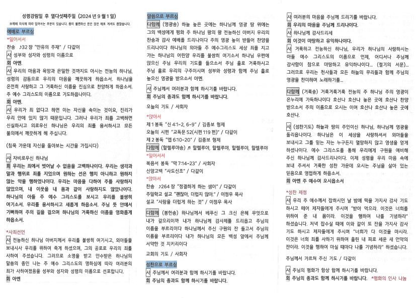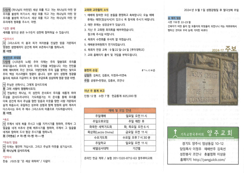 2024년 9월 1일 주보 작성자 정보 담임목사 작성 작성일 2024.09.04 15:44 컨텐츠 정보 1,130 조회 목록 본문 성령강림일 후 열다섯째주일 SNS 공유 관련자료 이전 한가위가정예배주보1 작성일 2024.09.05 16:59 다음 2024년 8월 25일 주보 작성일 2024.08.30 16:36 댓글 0 등록된 댓글이 없습니다. 로그인한 회원만 댓글 등록이 가능합니다. 목록
