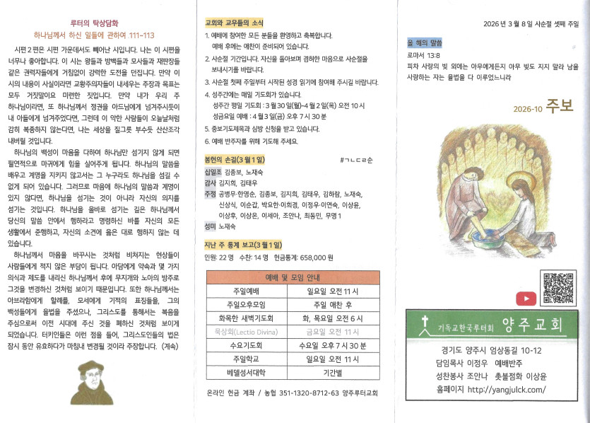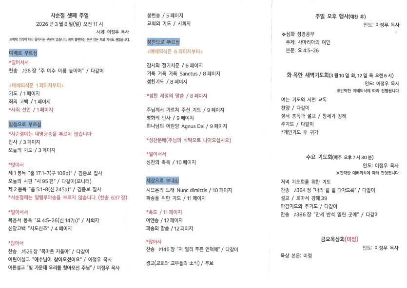 2026년 3월 8일 주보 작성자 정보 담임목사 작성 작성일 2026.03.13 15:41 컨텐츠 정보 63 조회 목록 본문 사순절 셋째 주일 SNS 공유 관련자료 이전 2026년 3월 15일 주보 작성일 2026.03.17 16:25 다음 2026년 3월 1일 주보 작성일 2026.03.07 02:44 댓글 0 등록된 댓글이 없습니다. 로그인한 회원만 댓글 등록이 가능합니다. 목록